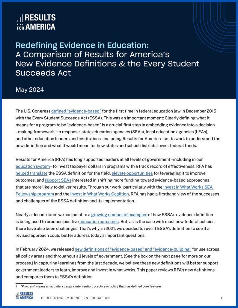 Results for America is also supporting state education leaders in targeted states to incent and drive school districts and schools to build and use evidence to improve their lowest-performing schools. RFA’s Evidence in Education Lab is helping state leaders use their new authority, flexibility, and resources under the Every Student Succeeds Act (ESSA) to increase the amount and quality of evidence created and used by their school districts and schools and drive better outcomes for millions of students across the country.