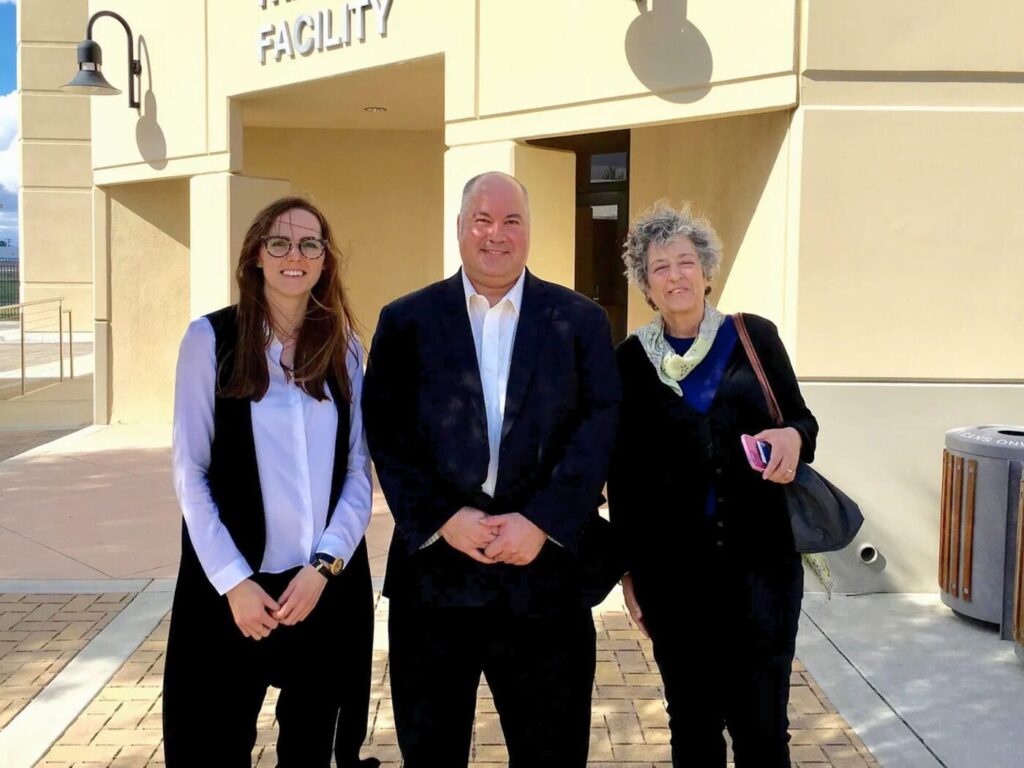 Former WWC Senior Communications Manager Kristin Taylor, Chris McMasters and Sharman Stein in front of Corona’s water treatment facility during a WWC site visit in 2018. Corona was Sharman’s last site visit.
